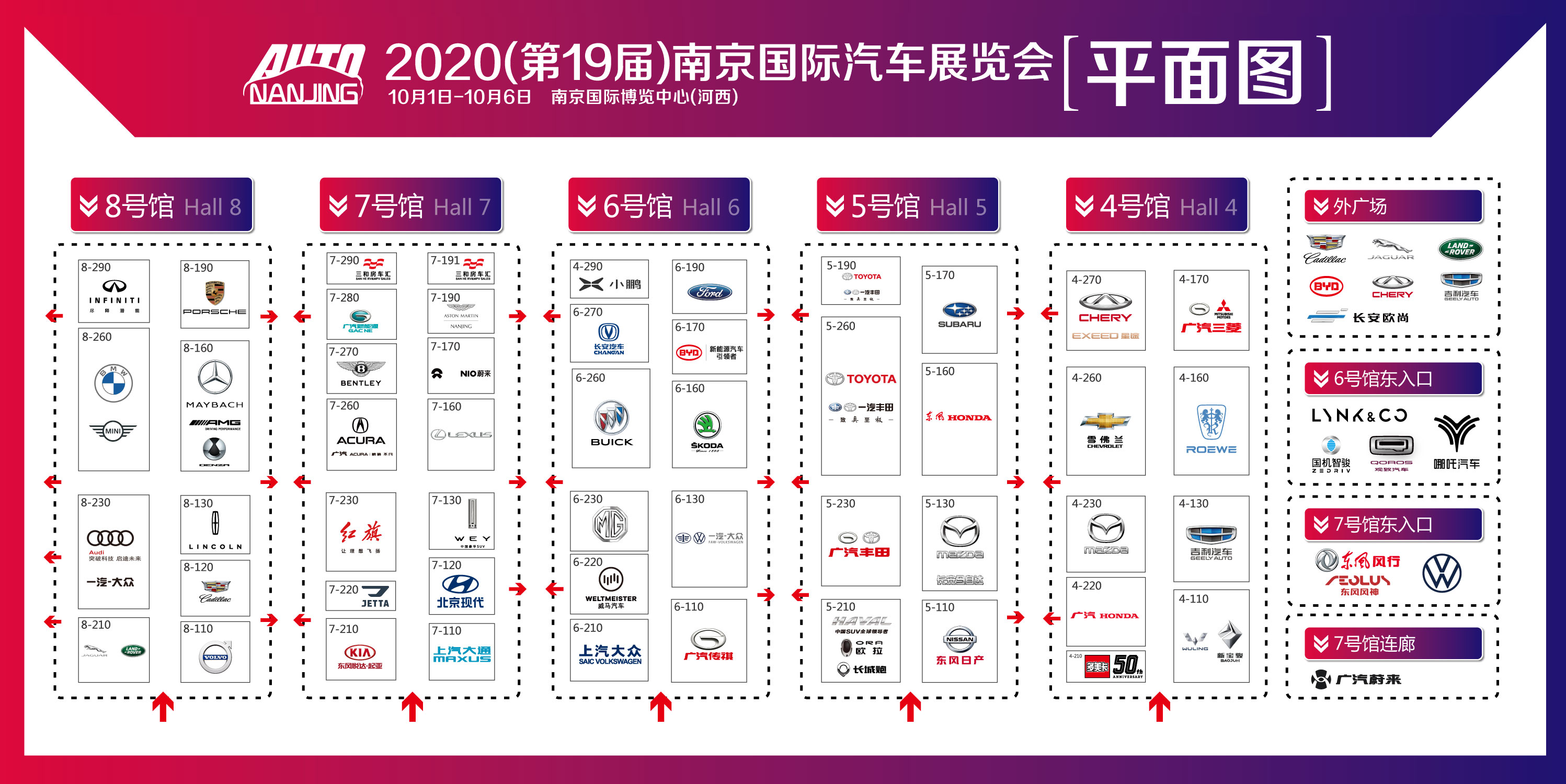10月1-6日,2020(第十九届)南京国际汽车展览会暨2020江苏新能源汽车展览会(简称:2020南京国际车展),将在南京国际博览中心举办,车展“展位图”新鲜出炉,请各位观众预先了解现场品牌展商情况。