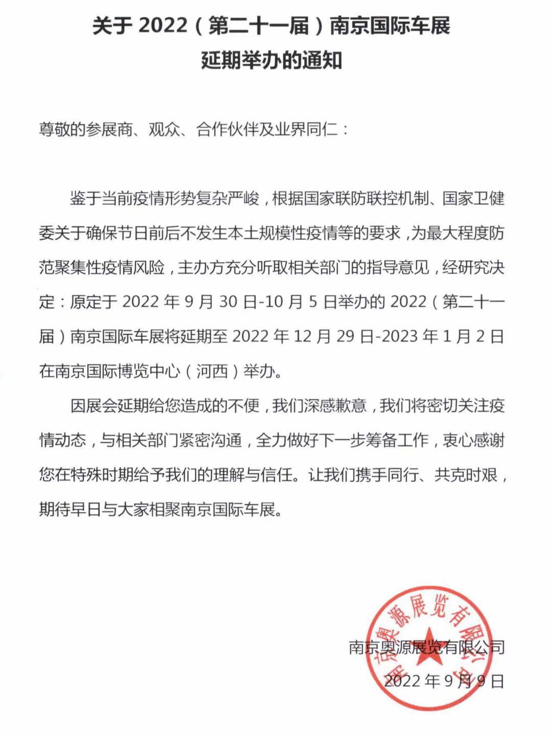 金九银十来相会,距今已有十八载,国庆看车展已然成为了很多车友的习惯和乐趣,然今年因疫情形势复杂严峻,为了让参展商舒心参展,观众安全参观,车展主办方经谨慎研究决定:原定于2022年9月30日-10月5日举办的2022(第二十一届)南京国际车展将延期至2022年12月29日-2023年1月2日在南京国际博览中心(河西)举办。